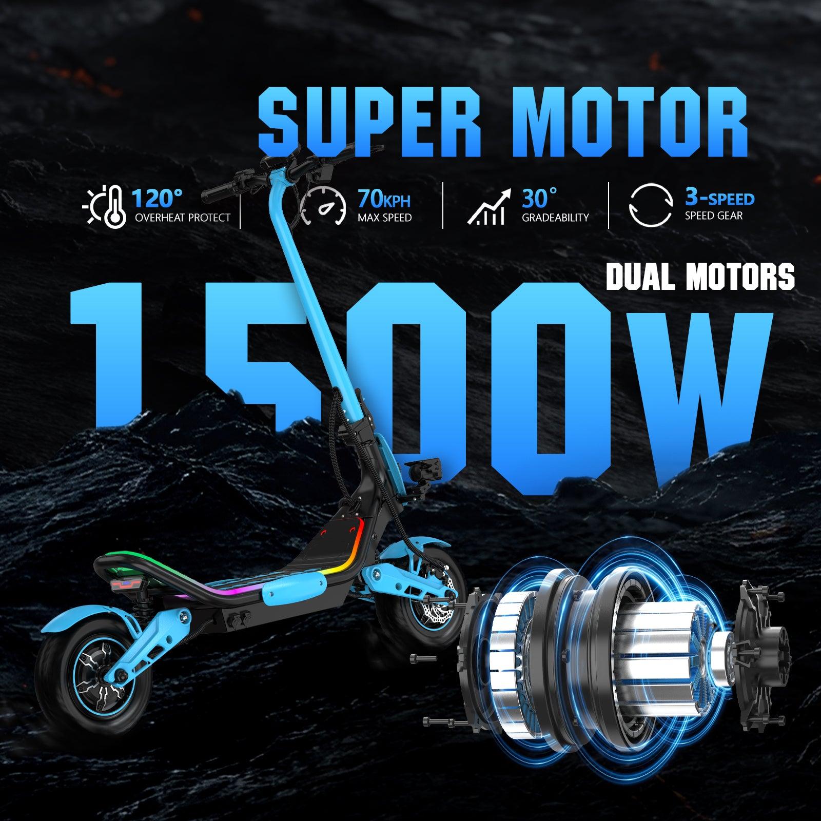 • High-Voltage Dual-Motor Power: Features dual 1500W motors (3000W combined) powered by a 60V system, designed for strong acceleration and the ability to tackle steep inclines up to 30 degrees.