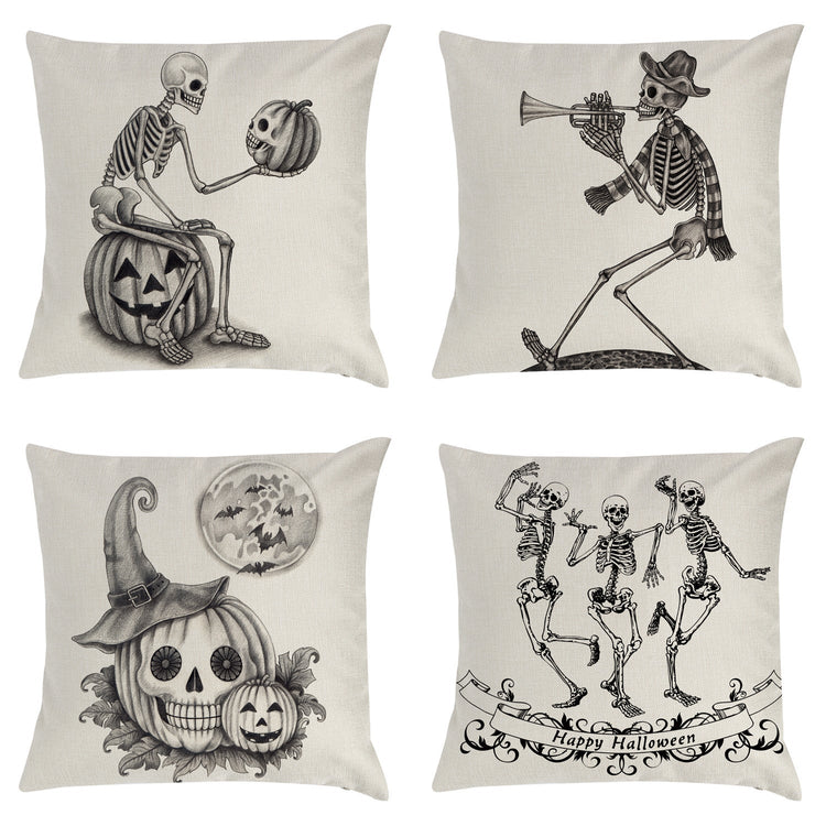 KTX-794963 Halloween Themed Pillow Cover with Skull and Pumpkin Designs - 45x45cm Linen Cushion Case